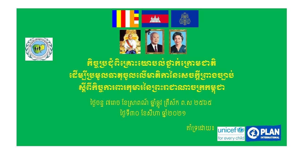 សង្គមកិច្ច# ថ្ងៃទី៣០ ខែសីហា ឆ្នាំ២០២១ លោកជំទាវ ខៀវ បូរី រដ្ឋលេខាធិការក្រសួងសង្គមកិច្ច អតីតយុទ្ធជន និងយុវនីតិសម្បទា អញ្ជើញជាអធិបតីក្នុងកិច្ចប្រជុំពិគ្រោះយោបល់ថ្នាក់ក្រោមជាតិដើម្បីប្រមូលធាតុចូលលើមាតិកានៃសេចក្តីព្រាងច្បាប់ ស្ដីពីកិច្ចការពារកុមារ នៃព្រះរាជាណាចក្រកម្ពុជា រៀបចំដោយ លេខាធិការដ្ឋានរៀបចំសេចក្តីព្រាងច្បាប់ស្តីពីកិច្ចការពារកុមារ នៃក្រសួងសង្គមកិច្ច អតីតយុទ្ធជន និងយុវនីតិសម្បទា ដោយមានការគាំទ្រពីអង្គការ Unicef និងអង្គការ PLAN។