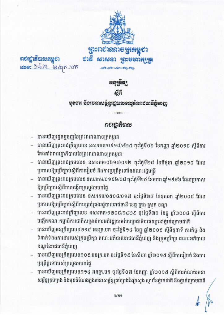 • អនុក្រឹត្យ ស្តីពីមុខងារចនាសម្ព័ន្ធរដ្ឋបាលក្រុង