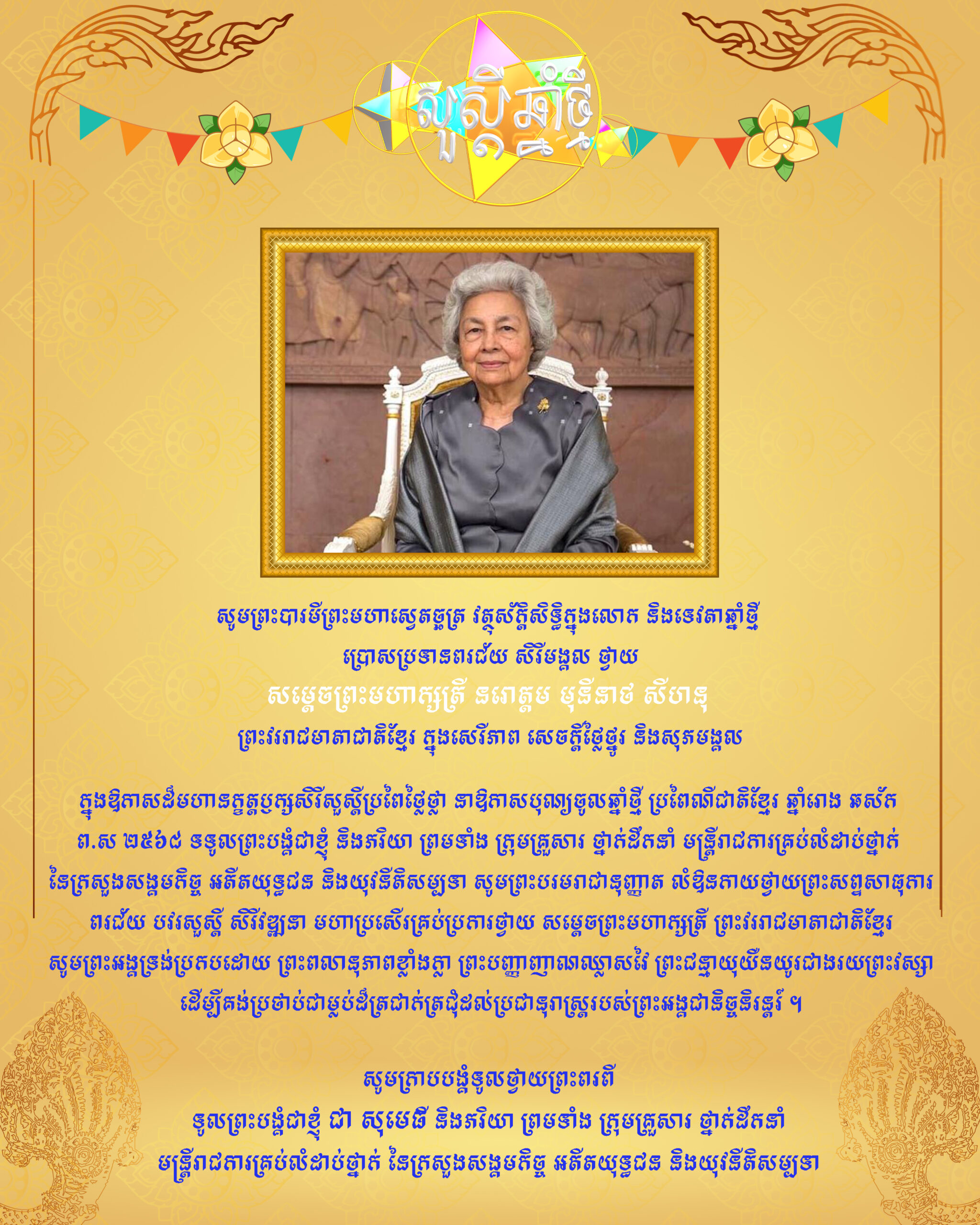 ឯកឧត្តមរដ្ឋមន្រ្តី ជា សុមេធី ផ្ញើរសារលិខិតថ្វាយព្រះពរ ក្រាបបង្គំទូលថ្វាយ សម្តេចព្រះមហាក្សត្រី នរោត្តម មុនិនាថ សីហនុ ព្រះវររាជមាតាជាតិខ្មែរ ក្នុងសេរីភាព សេចក្តីថ្លៃថ្នូរ និងសុភមង្គល ជាទីគោរពសក្ការៈដ៏ខ្ពង់ខ្ពស់បំផុត ក្នុងឱកាសចូលឆ្នាំថ្មី ប្រពៃណីជាតិខ្មែរ ឆ្នាំរោង ឆស័ក ព.ស ២៥៦៨ ត្រូវនឹងថ្ងៃទី១៣ ខែមេសា ឆ្នាំ២០២៤ ខាងមុខនេះ ។