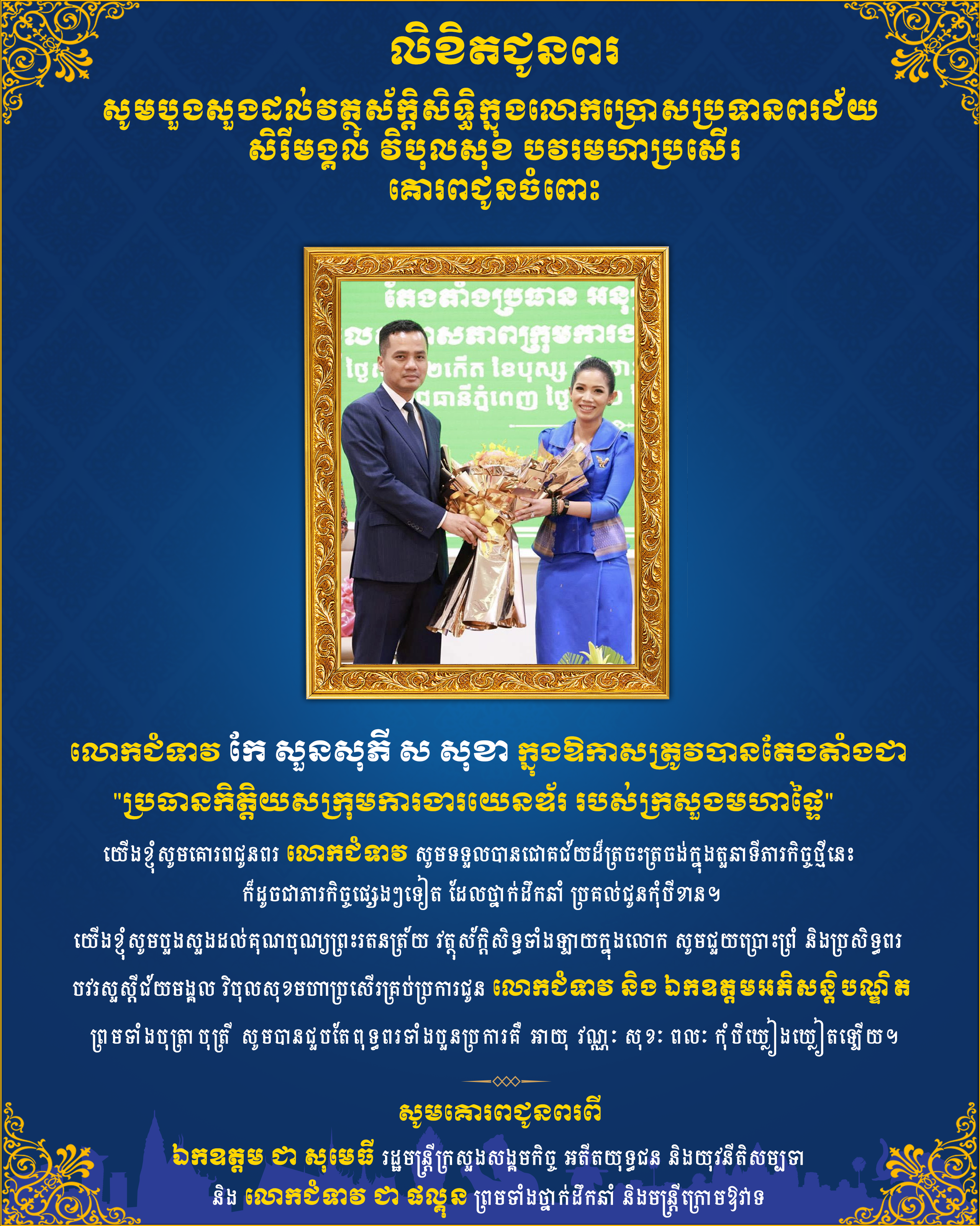 ឯកឧត្តម ជា សុមេធី រដ្ឋមន្ត្រីក្រសួងសង្គមកិច្ច អតីតយុទ្ធជននិងយុវនីតិសម្បទា ផ្ញើរសារគោរពជូន លោកជំទាវ កែ សួនសុភី ស សុខា ក្នុងឳកាសត្រូវបានតែងតាំងជា ប្រធានកិត្តិយសក្រុមការងារយេនឌ័រ របស់ក្រសួងមហាផ្ទៃ