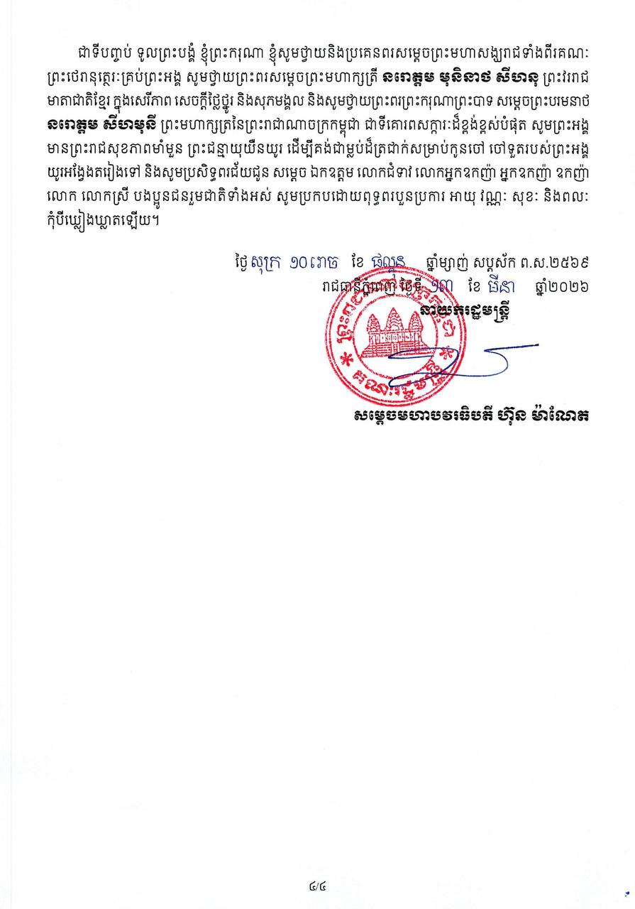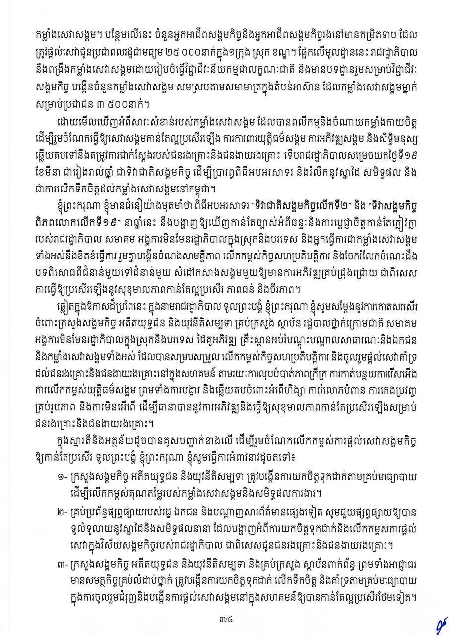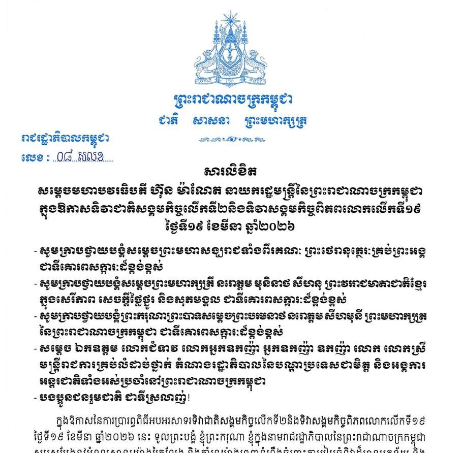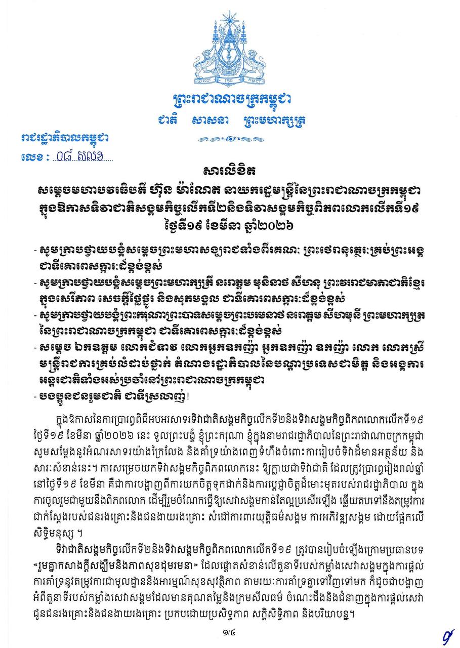 សារលិខិត សម្តេចមហាបវរធិបតី ហ៊ុន ម៉ាណែត នាយករដ្ឋមន្ត្រីនៃព្រះរាជាណាចក្រកម្ពុជា ក្នុងឱកាសទិវាជាតិសង្គមកិច្ចលើកទី២និងទិវាសង្គមកិច្ចពិភពលោកលើកទី១៩ ថ្ងៃទី១៩ ខែមីនា ឆ្នាំ២០២៦