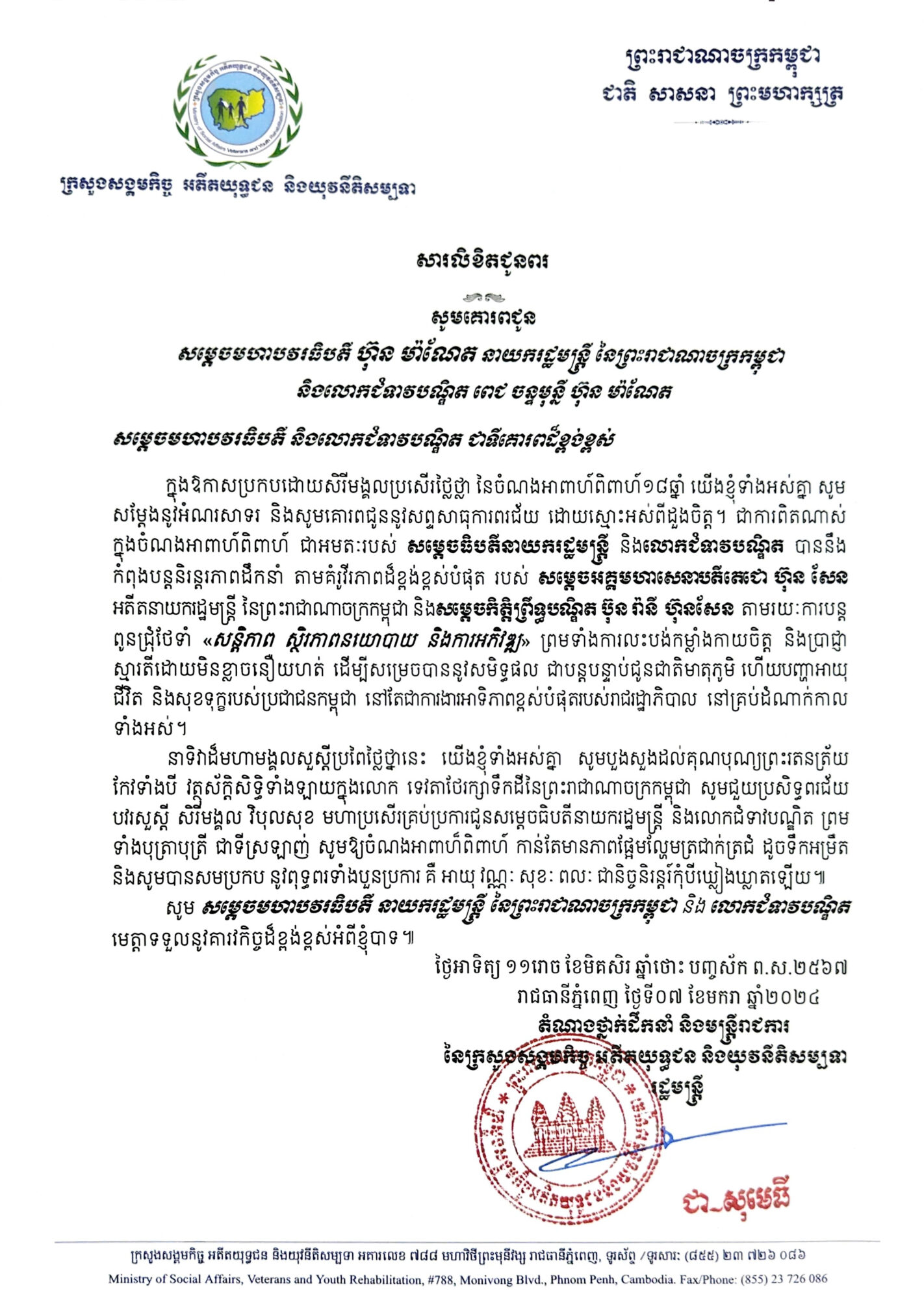 ឯកឧត្តម ជា សុមេធី ផ្ញើសារលិខិតគោរពជូនពរ សម្តេចមហាបវរធិបតី ហ៊ុន ម៉ាណែត និងលោកជំទាវបណ្ឌិត ពេជ ចន្ទមុន្នី ក្នុងឱកាសខួប ១៨ឆ្នាំនៃចំណងអាពាហ៍ពិពាហ៍ ត្រូវនឹងថ្ងៃទី៧ ខែមករា ឆ្នាំ២០២៤។
