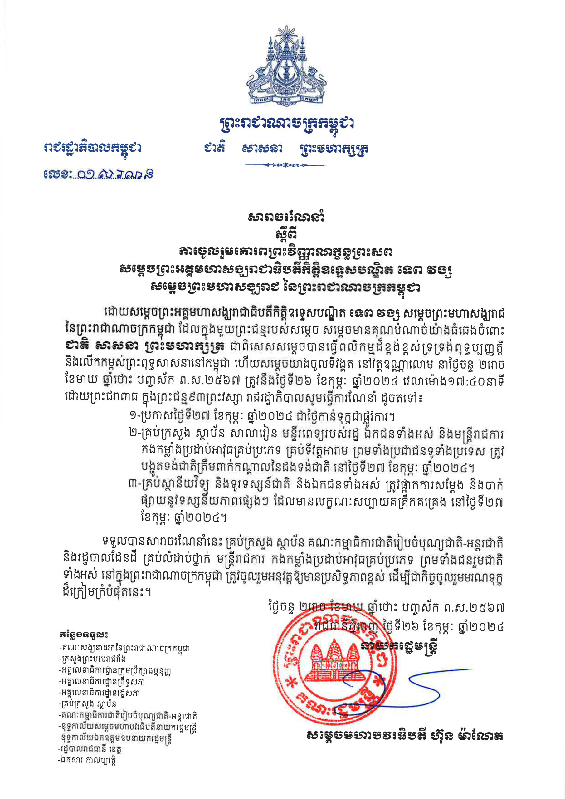 សារាចរណែនាំស្តីពីការចូលរួមគោរពព្រះវិញ្ញាណក្ខន្ធព្រះសព សម្តេចព្រះអគ្គមហាសង្ឃរាជាធិបតីកិត្តិឧទ្ទេសបណ្ឌិត ទេព វង្ស សម្តេចព្រះមហាសង្ឃរាជ នៃព្រះរាជាណាចក្រកម្ពុជា