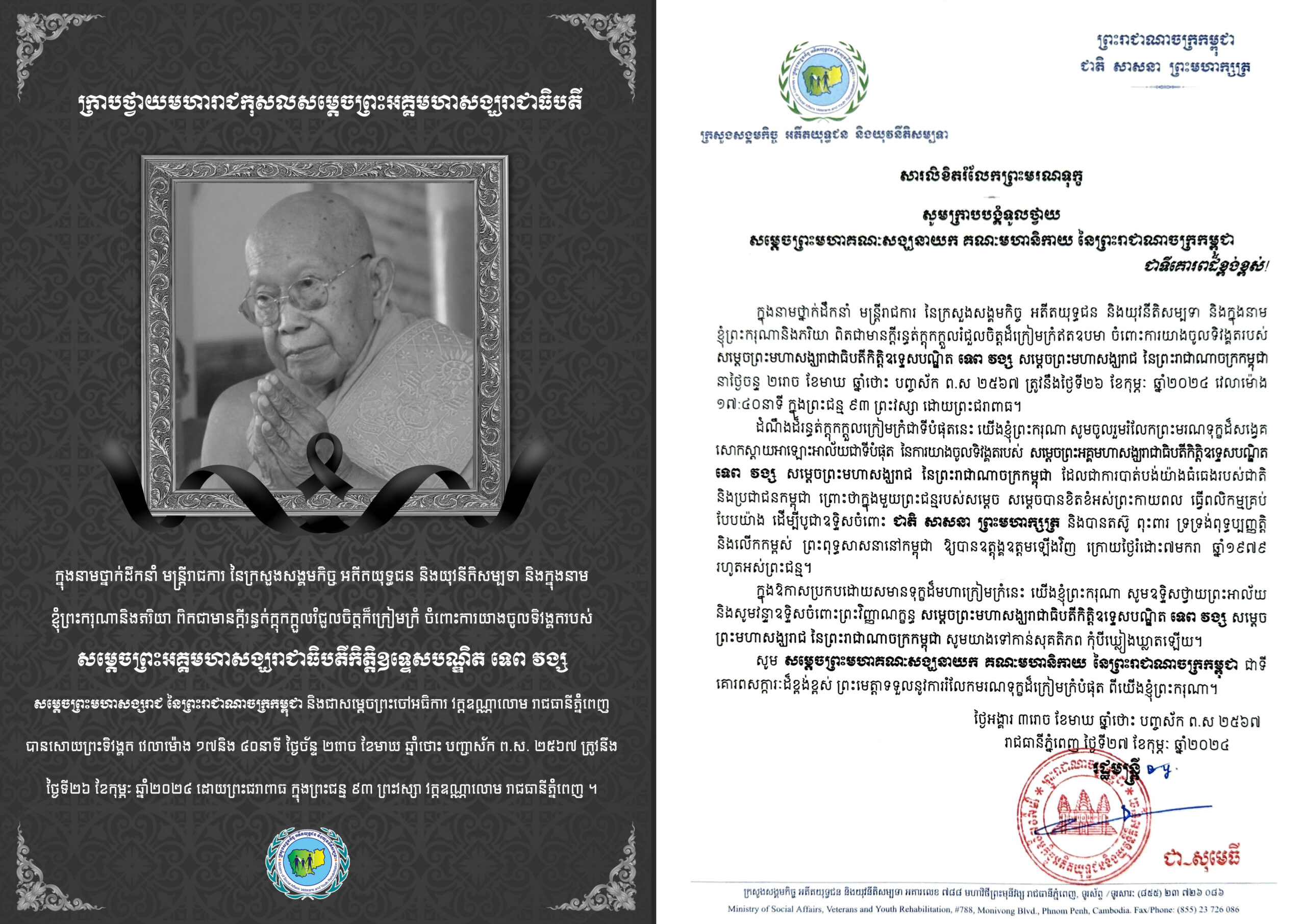 សូមក្រាបបង្គំទូលថ្វាយ សម្តេចព្រះមហាគណៈសង្ឃនាយក គណៈមហានិកាយ នៃព្រះរាជាណាចក្រកម្ពុជា ជាទីគោរពសក្ការៈដ៏ខ្ពង់ខ្ពស់ ចំពោះការយាងចូលព្រះទិវង្គតរបស់ សម្ដេចព្រះមហាសង្ឃរាជាធិបតី កិត្តិឧទ្ទេសបណ្ឌិត ទេព វង្ស សម្តេចព្រះមហាសង្ឃរាជ នៃព្រះរាជាណាចក្រកម្ពុជា។