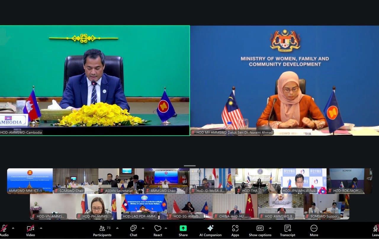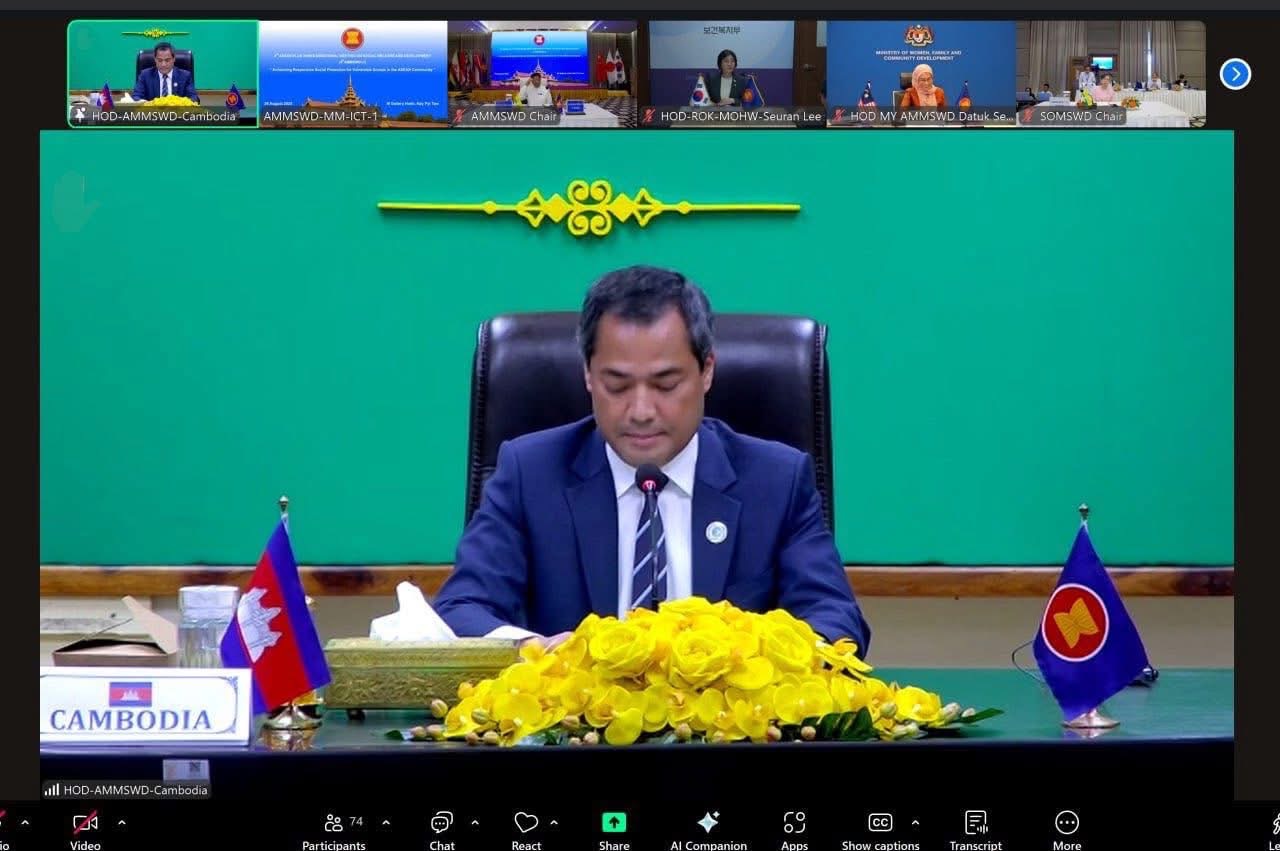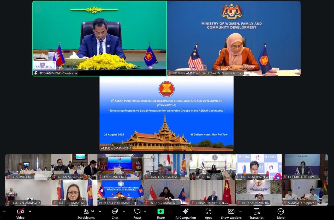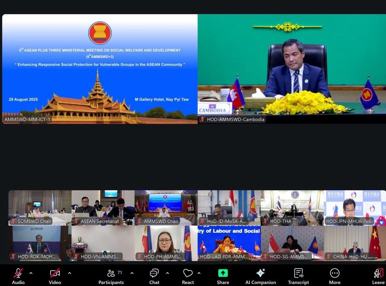 នៅរសៀលថ្ងៃសុក្រ ទី២៩ ខែសីហា ឆ្នាំ២០២៥ ឯកឧត្តម ជា សុមេធី រដ្ឋមន្ត្រីក្រសួងសង្គមកិច្ច អតីតយុទ្ធជន និងយុវនីតិសម្បទា និងថ្នាក់ដឹកនាំក្រសួង ស.អ.យ. បានចូលរួមកិច្ចប្រជុំរដ្ឋមន្ត្រីអាស៊ានបូកបី ស្ដីពីសុខុមាលភាព និងការអភិវឌ្ឍសង្គម លើកទី៨ (8th AMMSWD+3) «ការពង្រឹងកិច្ចគាំពារសង្គមដែលមានការឆ្លើយតប សម្រាប់ក្រុមជនងាយរងគ្រោះនៅក្នុងសហគមន៍អាស៊ាន» តាមប្រព័ន្ធវីដេអូ Conference នៅទីស្ដីការក្រសួង ស.អ.យ.។