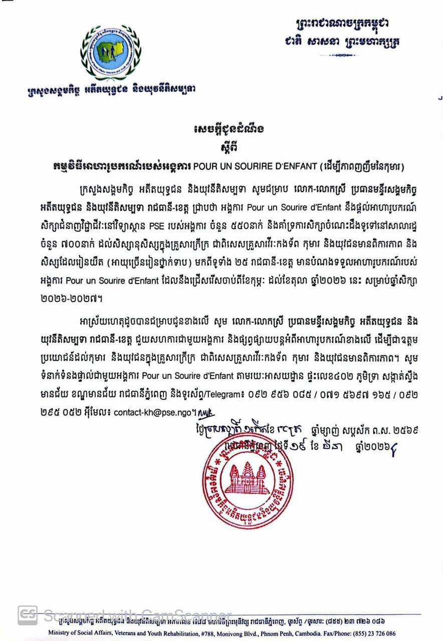• សេចក្តីជូនដំណឹង ស្តីពី កម្មវិធីអាហារូបករណ៍របស់អង្គការ POUR UN SOURIRE D’ENFANT (ដើម្បីភាពញញឹមនៃកុមារ)