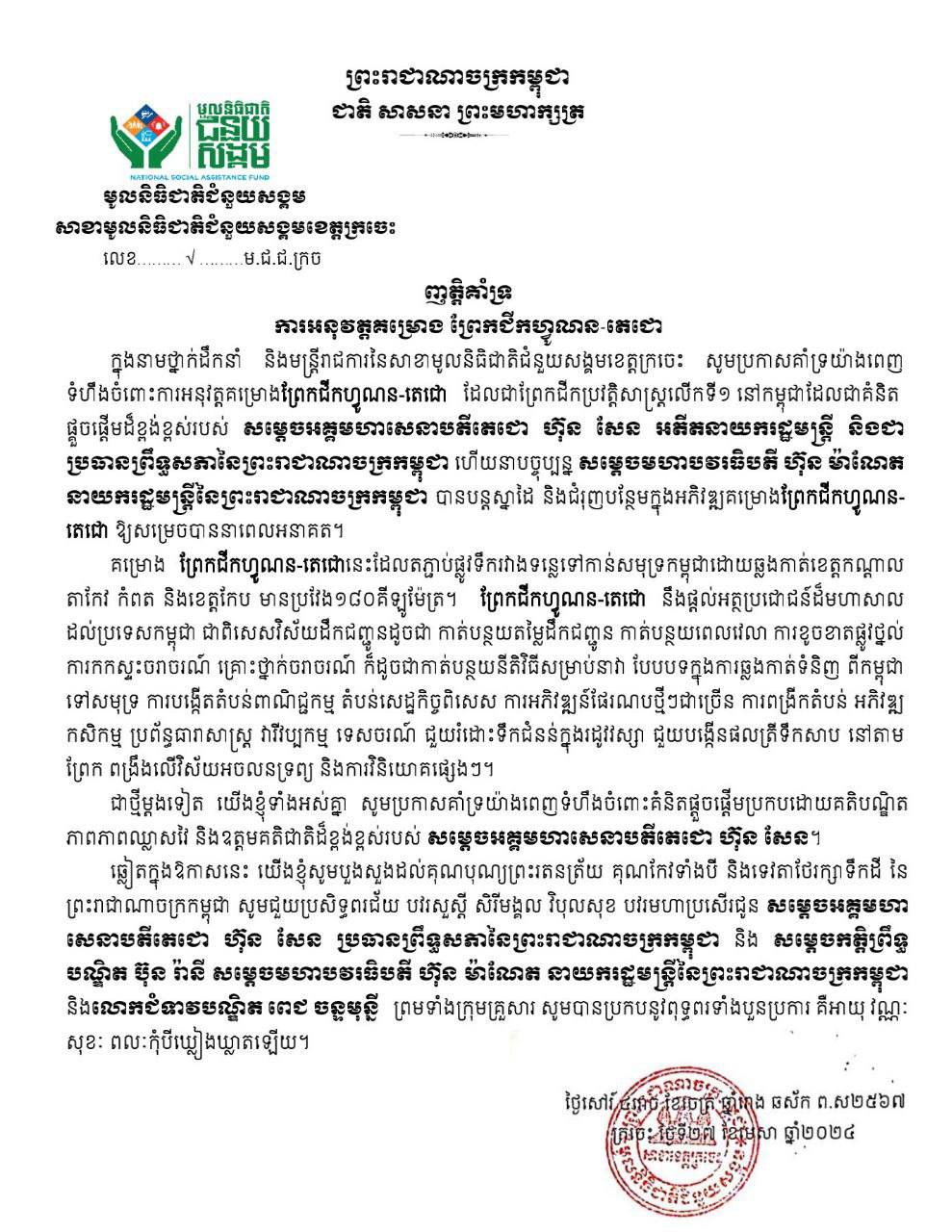 • ញត្តិគាំទ្ររបស់ អគ្គនាយកមូលនិធិជាតិជំនួយសង្គម ចំពោះការអនុវត្តគម្រោង “ព្រែកជីកហ្វូណន-តេជោ” ដែលជាព្រែកជីកប្រវត្តិសាស្ត្រលើកទី១ នៅព្រះរាជាណាចក្រកម្ពុជា។