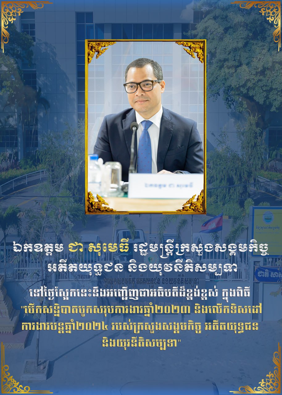 • សេចក្តីប្រកាសព័ត៌មានស្តីពីសន្និបាតបូកសរុបលទ្ធផលការងារឆ្នាំ២០២៣ និងលើកទិសដៅការងារឆ្នាំ២០២៤របស់ក្រសួងសង្គមកិច្ខ អតីតយុទ្ធជន និងយុវនីតិសម្បទា ដែលនិងប្រព្រឹត្តិទៅនៅថ្ងៃទី៥ -៦ ខែកុម្ភៈ ឆ្នាំ២០២៤ នៅទីស្តីការក្រសួង។