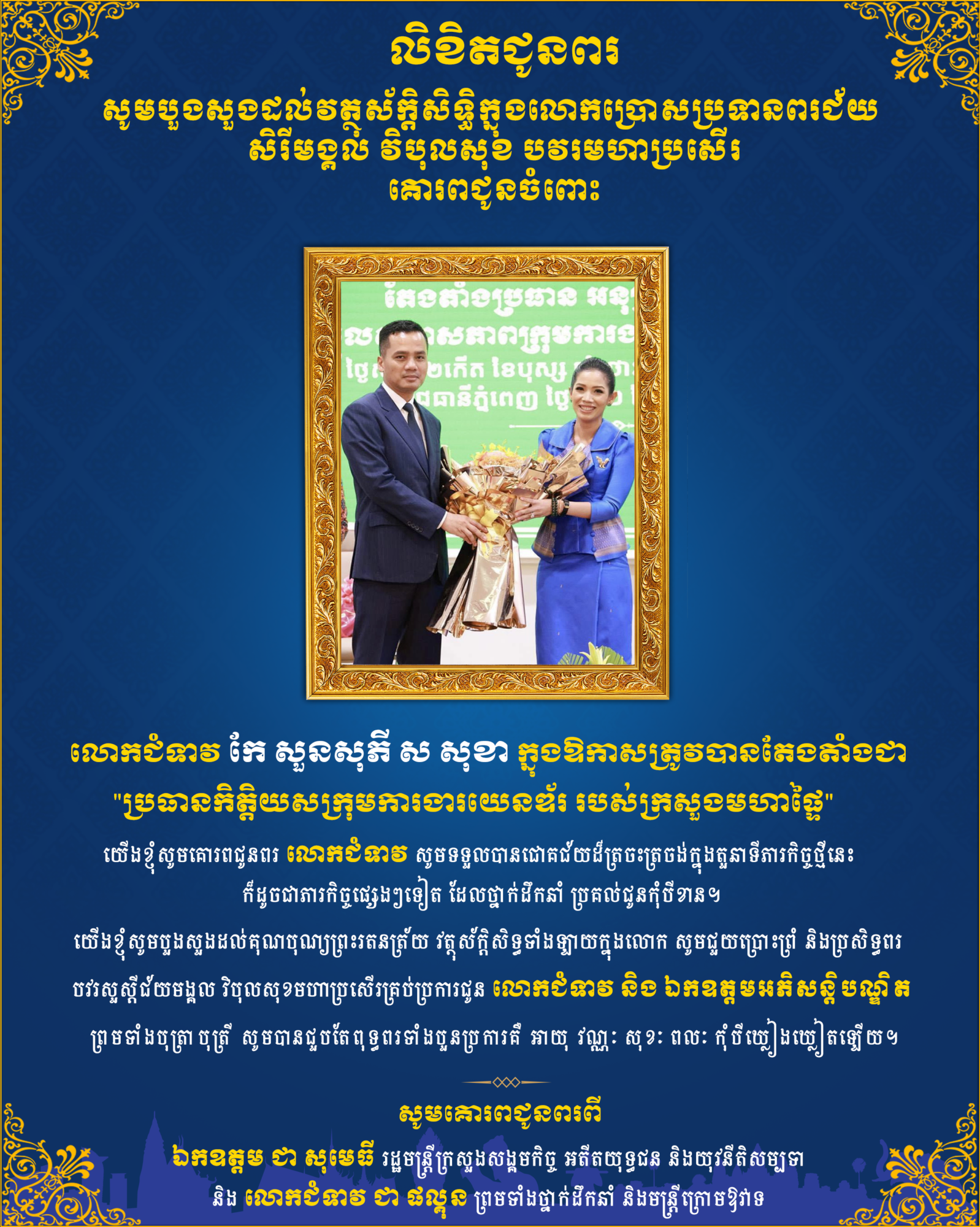 • ឯកឧត្តម ជា សុមេធី រដ្ឋមន្ត្រីក្រសួងសង្គមកិច្ច អតីតយុទ្ធជននិងយុវនីតិសម្បទា ផ្ញើរសារគោរពជូន លោកជំទាវ កែ សួនសុភី ស សុខា ក្នុងឳកាសត្រូវបានតែងតាំងជា ប្រធានកិត្តិយសក្រុមការងារយេនឌ័រ របស់ក្រសួងមហាផ្ទៃ