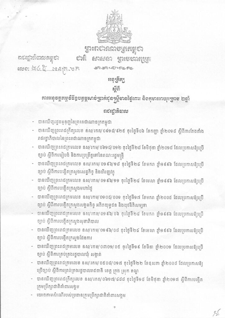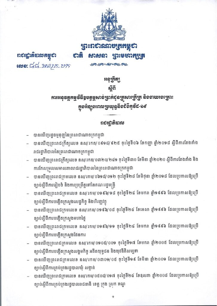 • អនុក្រឹត្យ ស្តីពីការអនុវត្តកម្មវិធីឧបត្ថម្ភសាច់ប្រាក់ជូនគ្រួសារក្រីក្រ និងងាយរងគ្រោះក្នុងអំឡុងពេលប្រយុទ្ធនឹជំងឺកូវីដ-១៩