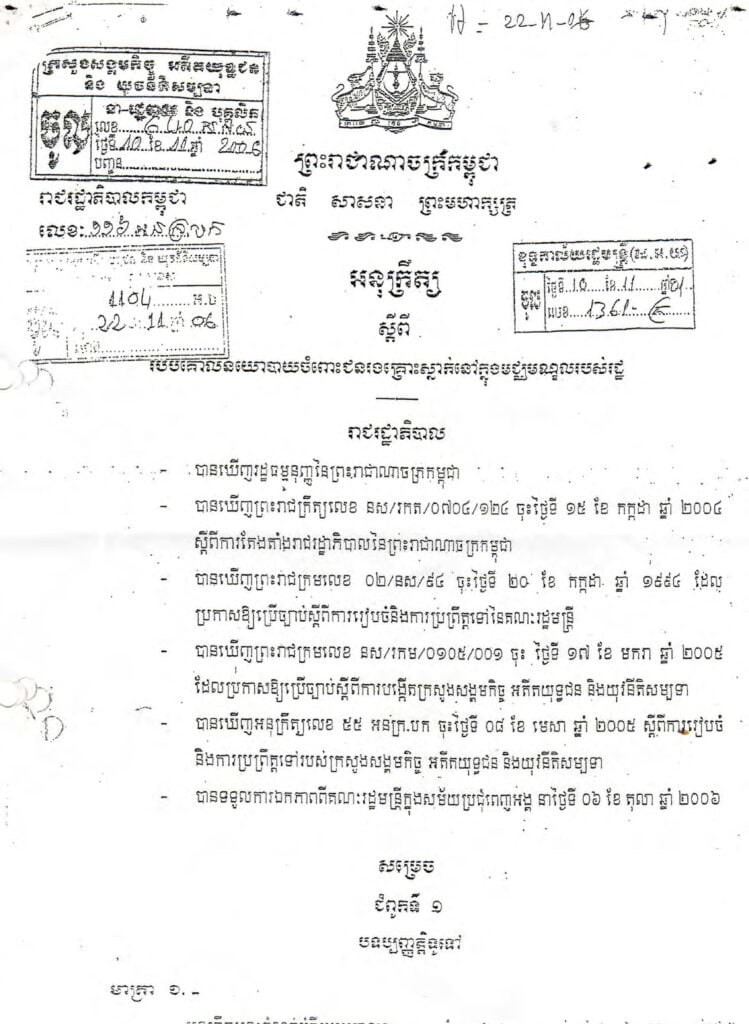 • អនុក្រឹត្យ ស្តីពីរបបគោលនយោបាយចំពោះជនរងគ្រោះស្នាក់នៅក្នុងមណ្ឌលរបស់រដ្ឋ